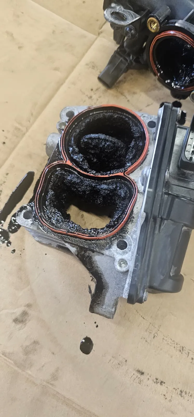 Bilens oljeventiler var frusna, vilket ledde till att oljan läckte genom tätningarna på grund av övertryck. Vid demontering av motorn upptäckte vi att EGR-ventilen läckte och hade smutsat ner insugsröret, gasreglaget och andra rör i systemet.